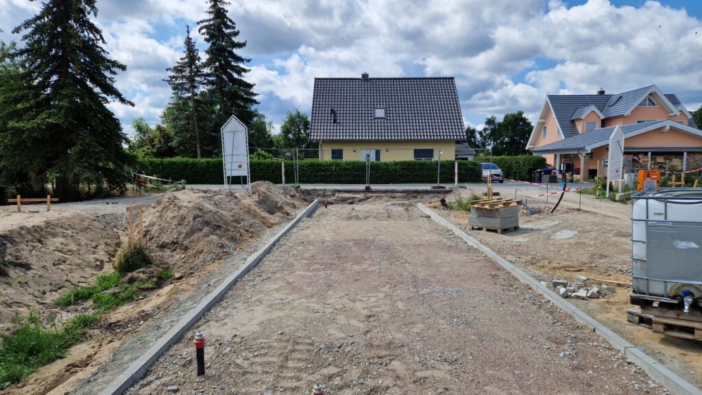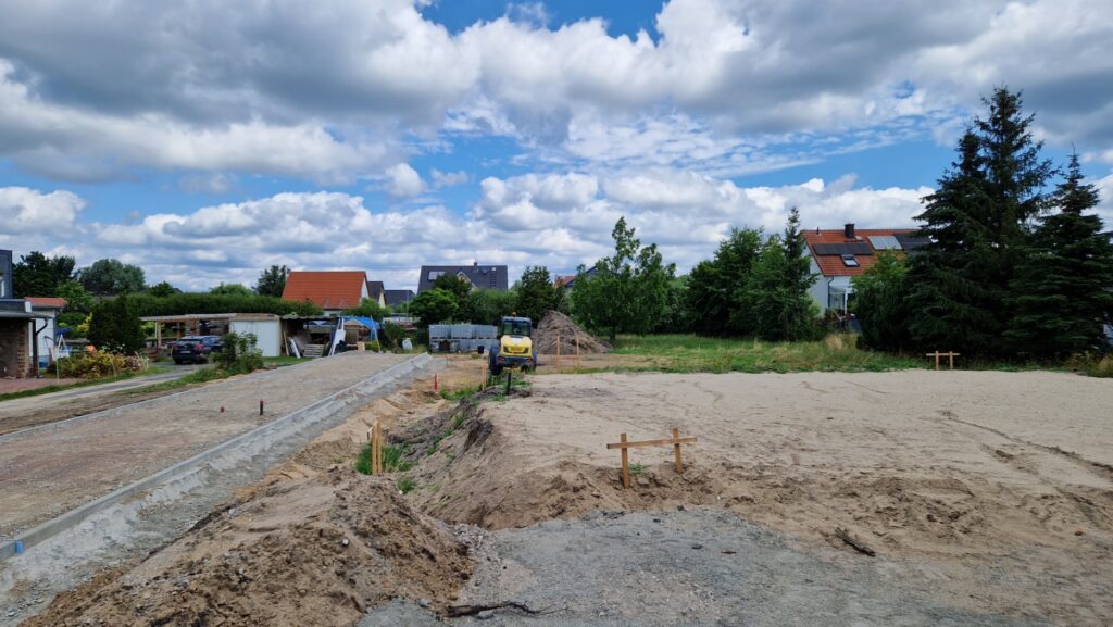 Ende 2021 erreichte der neu aufgestellte Bebauungsplan seine Rechtskraft – ein wichtiger Meilenstein, um die geplante Entwicklung verbindlich zu gestalten. Bereits im Jahr 2022 folgten die Erschließungsarbeiten: Verlegung sämtlicher Medienleitungen, Herstellung neuer Verkehrsflächen und die vollständige bauliche Vorbereitung der Grundstücke.