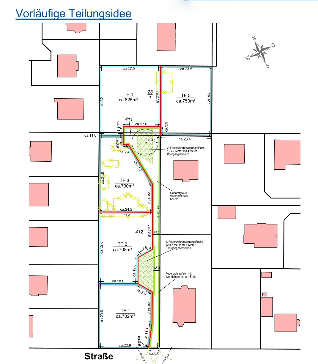 Denkbar ist eine Bebauung mit klassischen Einfamilienhäusern oder Bungalows. Auf der Fläche befinden sich derzeit noch einige Bestandsgebäude, welche abgerissen werden müssen (siehe Bilder). Die oben ersichtliche Teilungsskizze ist nur vorläufig und kann sich noch geringfügig verändern.